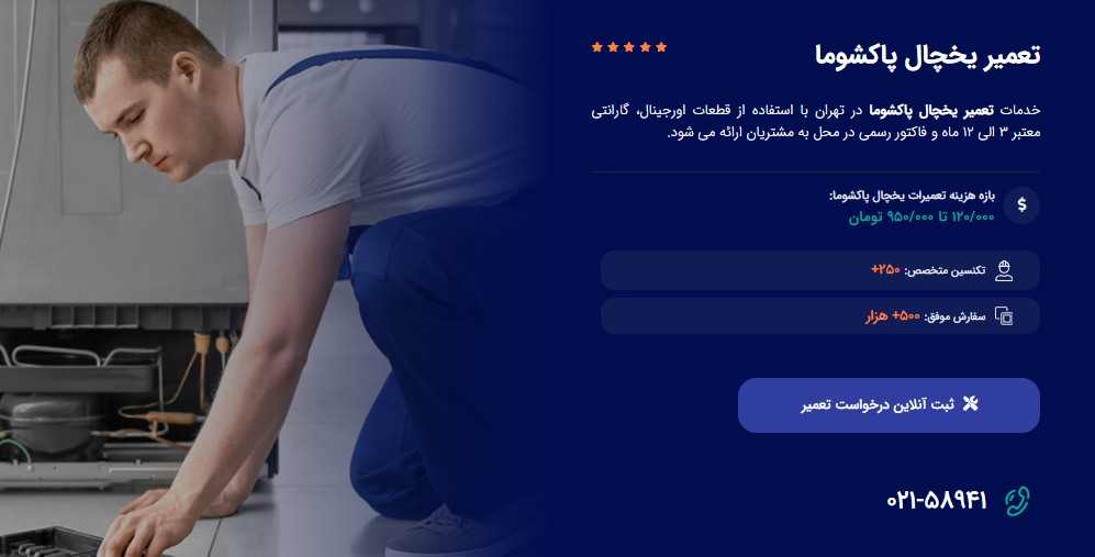 تکنسین ها ظرف ۲ ساعت در محل حاضر می شوند و خدمات در تمام مناطق تهران ارائه می شود. این مرکز همچنین تعمیر اجاق گاز، جاروبرقی و مایکروویو پاکشوما را با همان کیفیت بالا انجام می دهد.