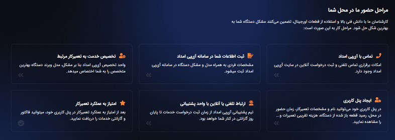 ۵. سرویس در محل: بدون نیاز به حمل دستگاه، تکنسین ها در منزل شما حاضر می شوند. خدمات ۲۴ ساعته حتی در روزهای تعطیل در دسترس است.